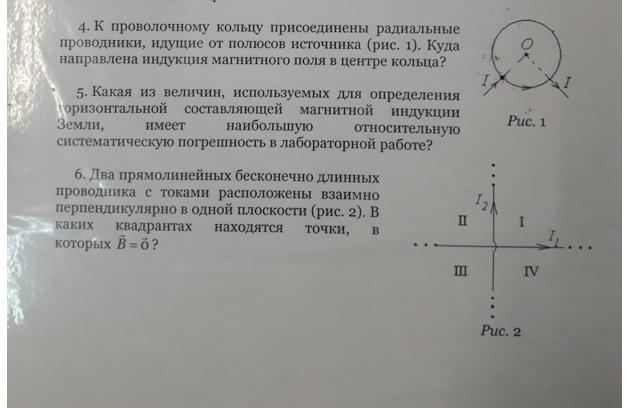 4)К проволочному кольцу присоединены радиальные проводники, идущие от полюсов источника. Куда направлена индукция магнитного поля в центре кольца?