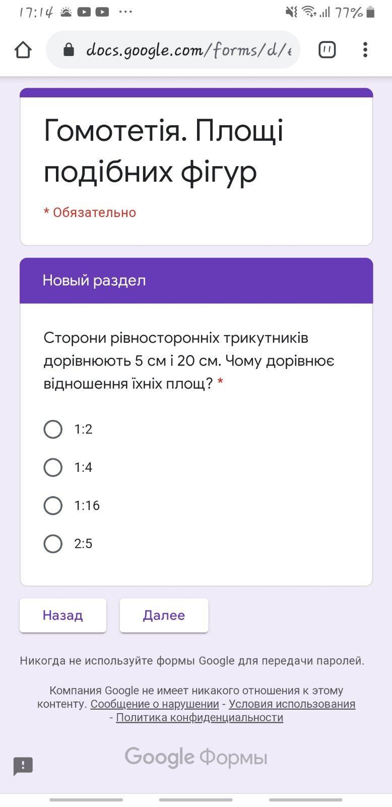 Відношення площ двох подібних трикутників дорівнює квадрату коефіціента подібності.