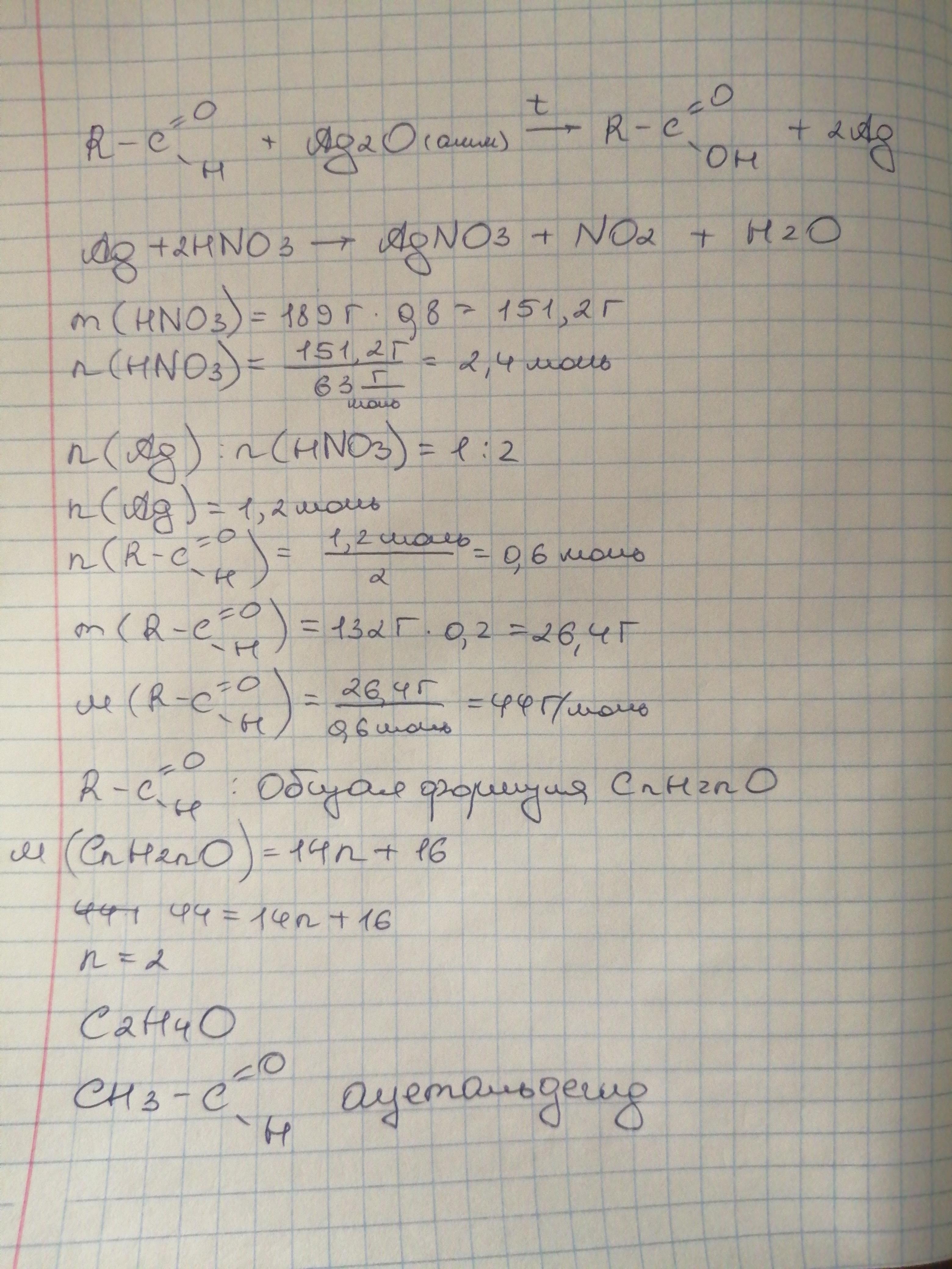 На укр:До водного розчину невідомого альдегіду масою 132 грама з масовою часткою альдегіду 20% додали надлишок р-н Ag2O(аміач). Випав осад для взаємодій з яким витратили 189 г речовину НN03 з масовою часткою 80 %. Встановити формулу альдегіду