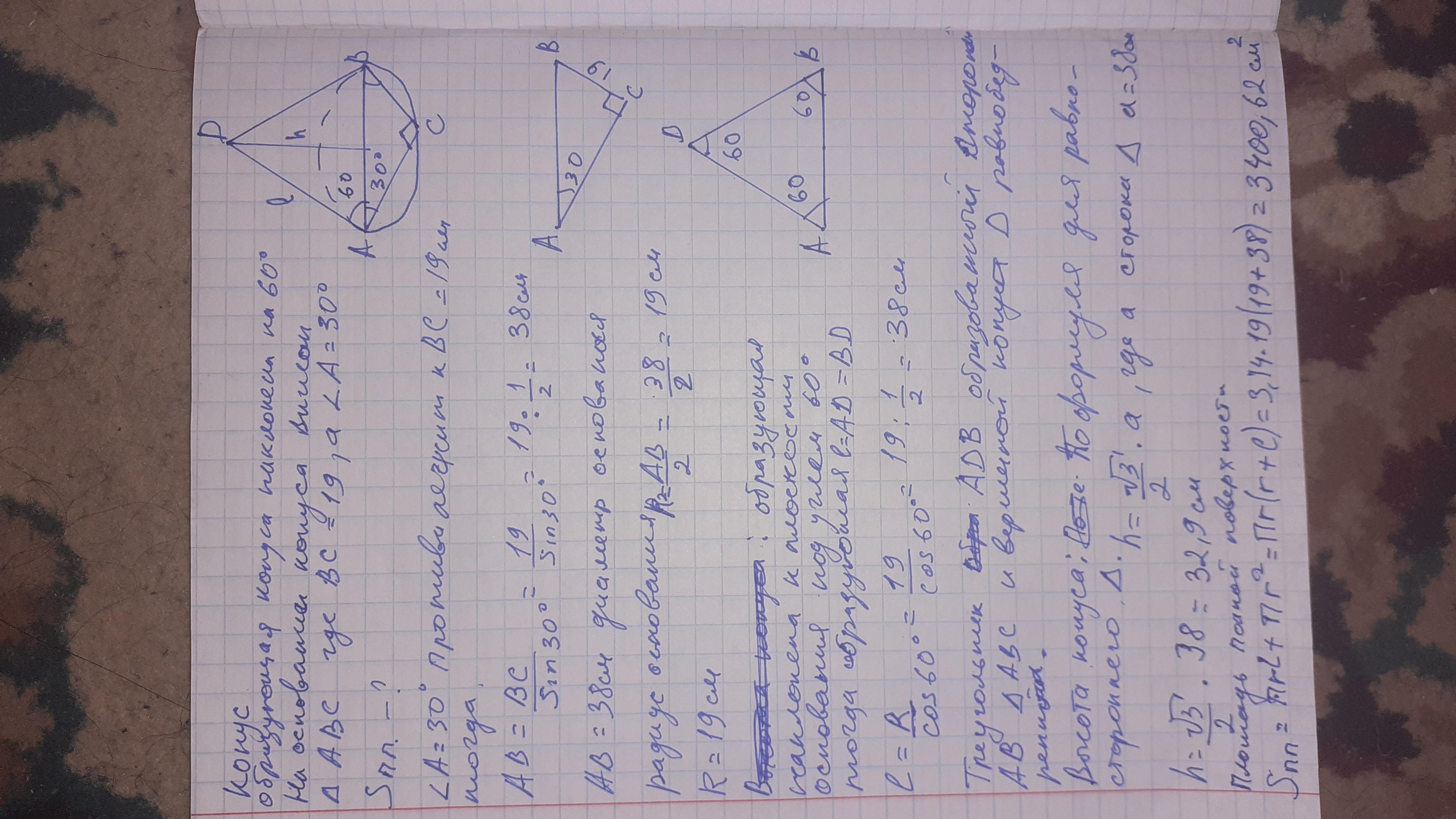 Образующая конуса наклонена к плоскости основания под углом 60°. В основание конуса вписан треугольник, у которого одна сторона равна 19 см, а противолежащий угол равен 30°.