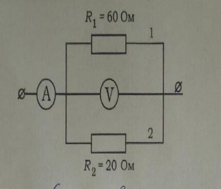 Определите показание амперметра и вольтметра, если по проводнику сопротивлением R1 идёт ток силой 0,1а.