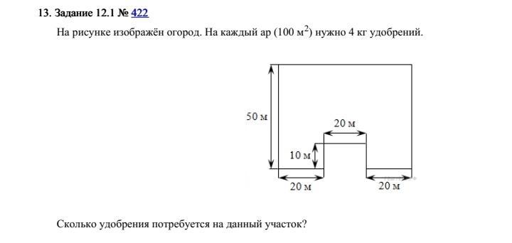смотри, сперва находим общую площадь, от нее отнимаем лишний кусок (снизу который со сторонами 10*20), далее делим на 100, чтоб понять, сколько аров нужно удобрить, а т.к. на каждый ар нужно 4кг, то умножаем на 4