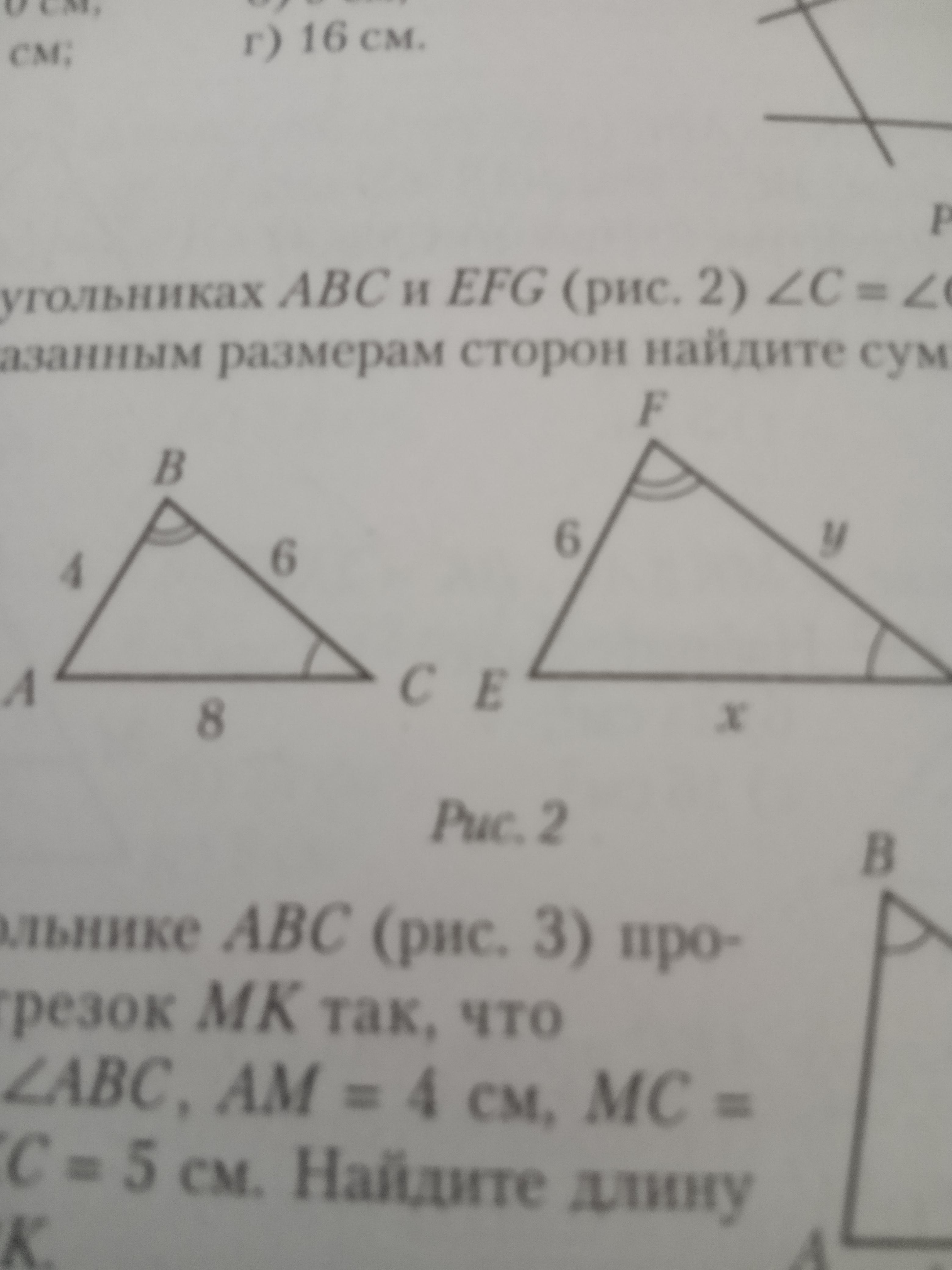 В треугольниках ABC и EFG угол C равен углу G, угол B равен углу F. По указанным размерам сторон найдите сумму x+y
