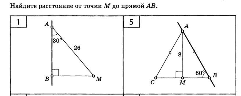 5) Треугольник ABM прямоугольный. Сумма углов трейгольника 180°. Поэтому угол A = 180° - 90° - 60° = 30°. Расстояние от М до AB это перпендикуляр к прямой AB проходящий через т. М. Пусть место пересечение этого перпендикуляра будет точка D. Тогда MD/AM = SinA