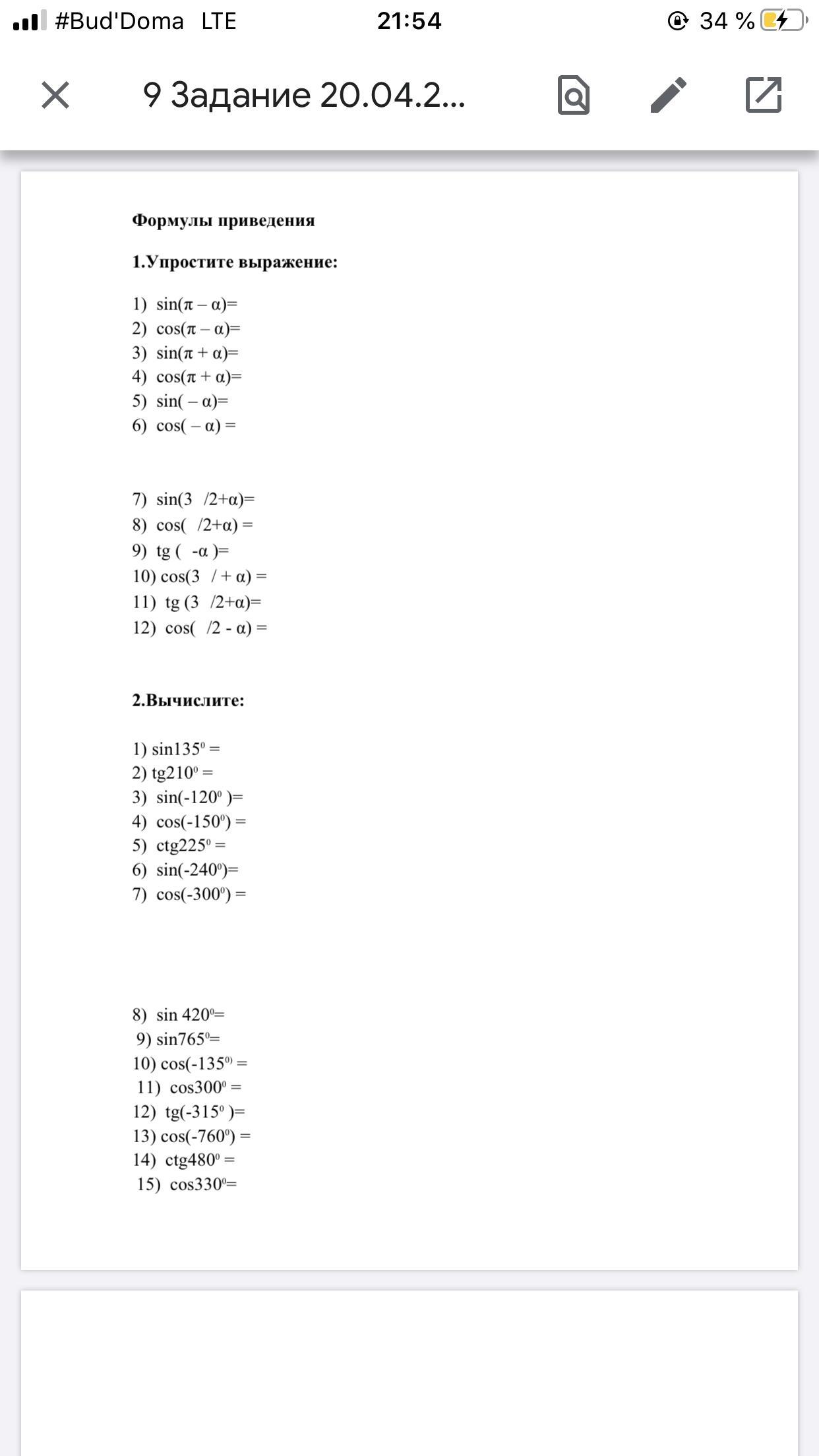 10) cos(-1350) = 11) cos3000 = 12) tg(-3150 )=