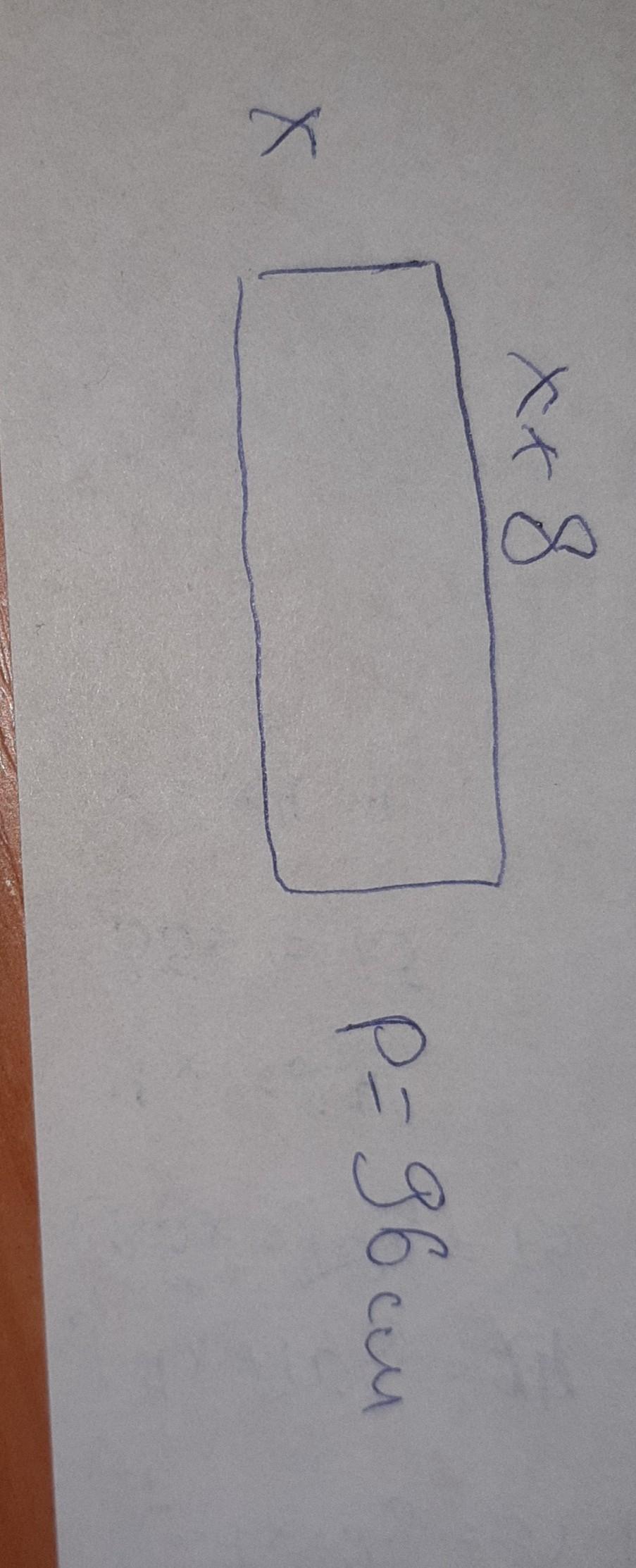 Длина прямоугольника на 8 см больше, чем ширина. Найти площадь и стороны прямоугольника, если его периметр равен 96 см.