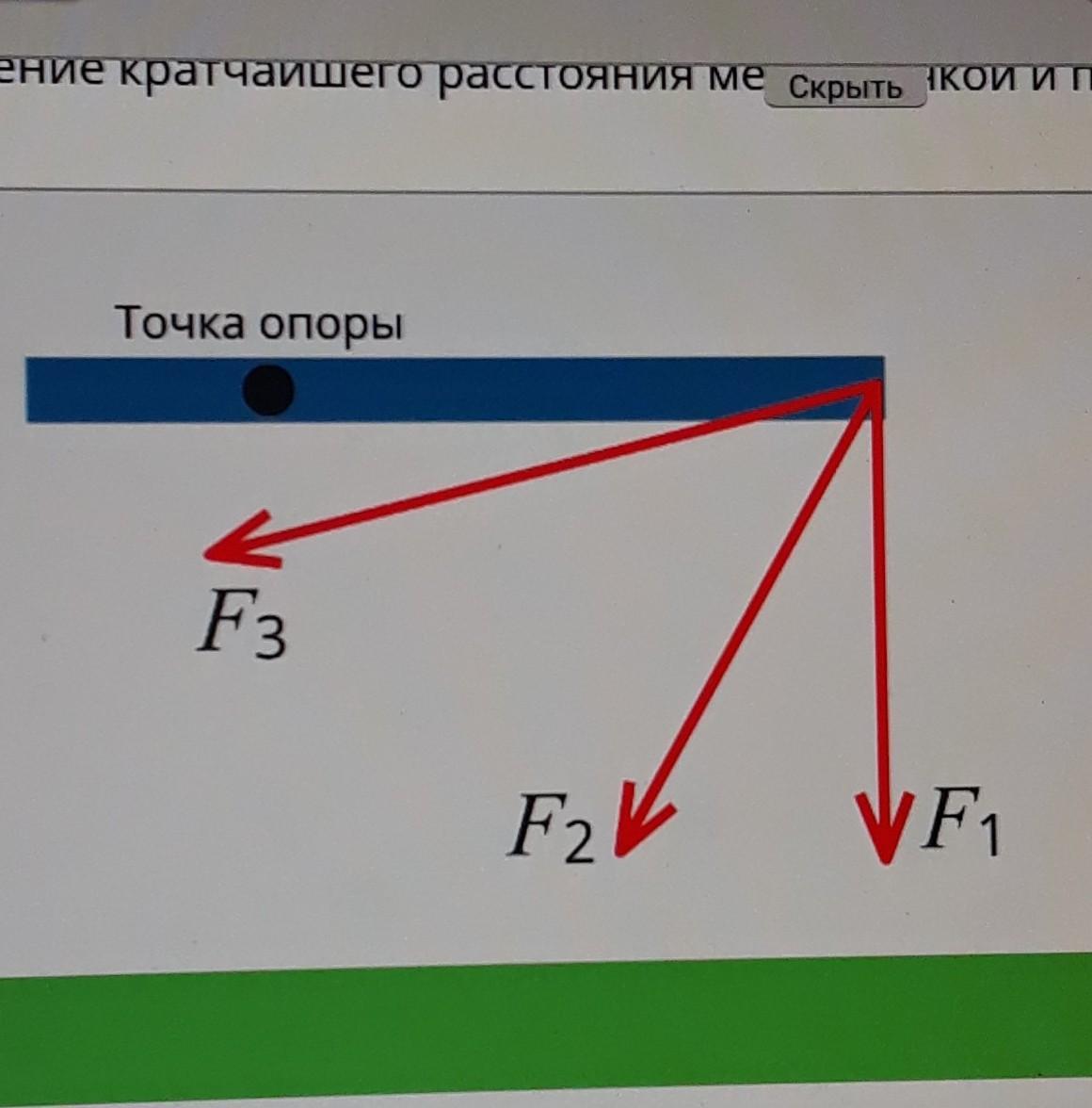 три силы приложены к одной точке рычага как указано на рисунке. плечо какой силы будет самым маленьким
