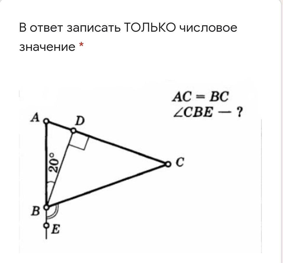 Объяснение: 180° -20° -90° = 70° .Если треугольник Равнобедренной, то угол BAC = CBA; 180° -70° =110°