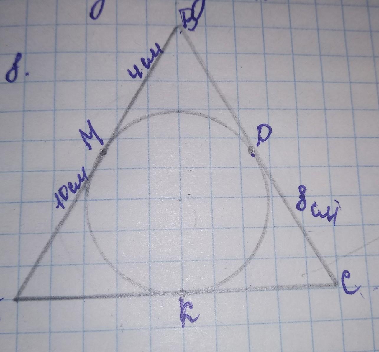 8.Коло, вписане в трикутник ABC, дотикається до його сторін AB, BC, AC в точках М, Р, K. Знайдіть периметр трикутника АВС, якщо AB=10 см, MB=4 см, PC=8 см.
