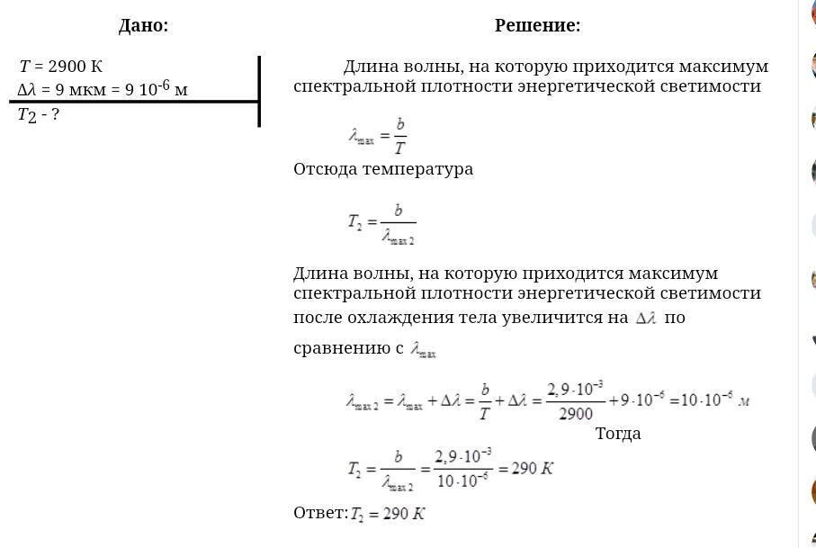 1. Задача: абсолютно чёрное тело имеет температуру 2900 К. На кукую длину волны приходится максимум его излучения?
