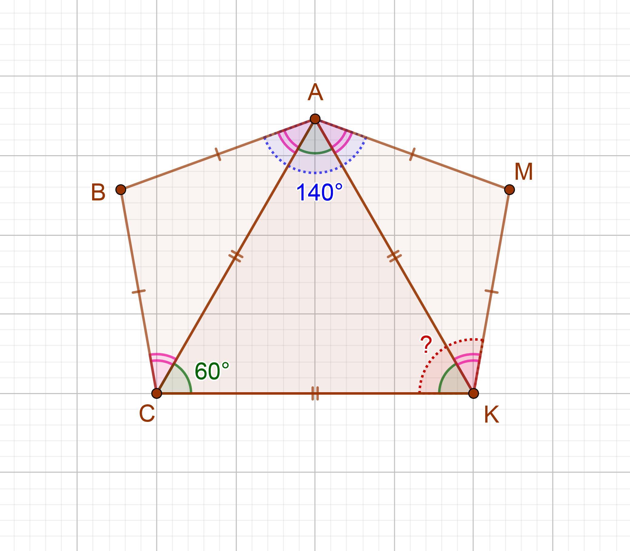 ΔABC = ΔAMK — по трьом сторонам ⇒ ∠BAC = ∠BCA = ∠MAK = ∠MKA = (140−60)/2 = 40°