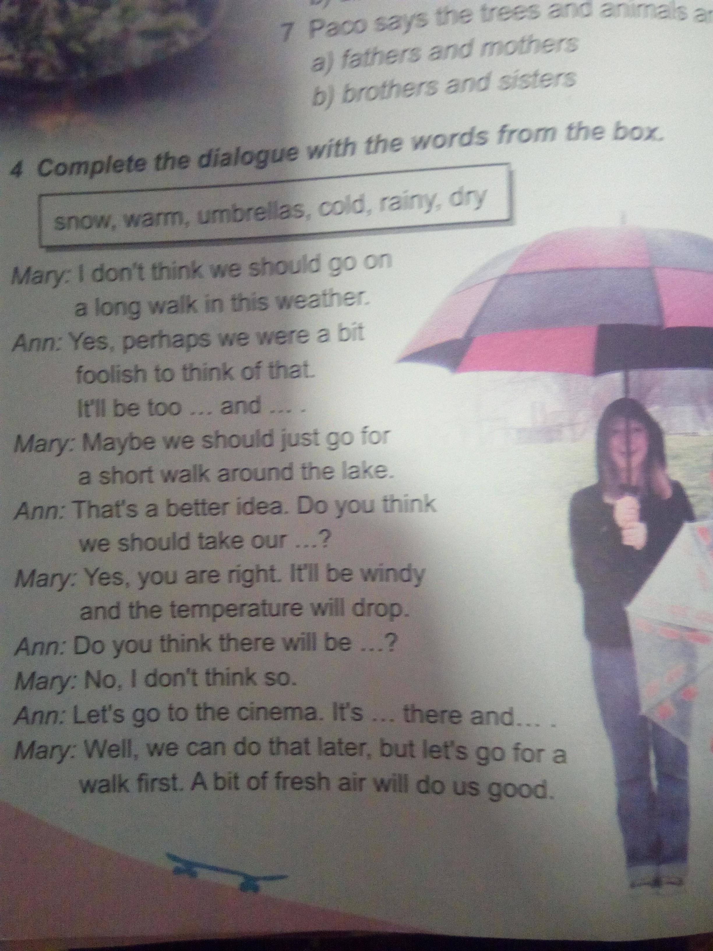 Мэри: Я не думаю, что в такую погоду мы должны долго гулять. Энн: Да, возможно, мы были немного глупы, чтобы думать об этом и ... Это будет слишком Мэри: Может, нам стоит просто прогуляться по озеру. Энн: Это лучшая идея. Как вы думаете, мы должны взять наш ..? Мэри: Да, ты прав. Будет ветрено, и температура упадет. Энн: Как вы думаете, будет ...? Мэри: Нет, я так не думаю. Энн: Пойдем в кино. Это ... там и .. Мэри: Ну, мы можем сделать это позже, но сначала пойдем на прогулку. Немного свежего воздуха пойдет нам на пользу.