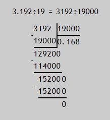 Чтобы разделить одну десятичную дробь на другую, переносим запятую вправо в делимом, на 3 знака , а в делителе приписываем столько нулей сколько в делителе после запятой . Получаем 3192 : 19000=0 ,168
