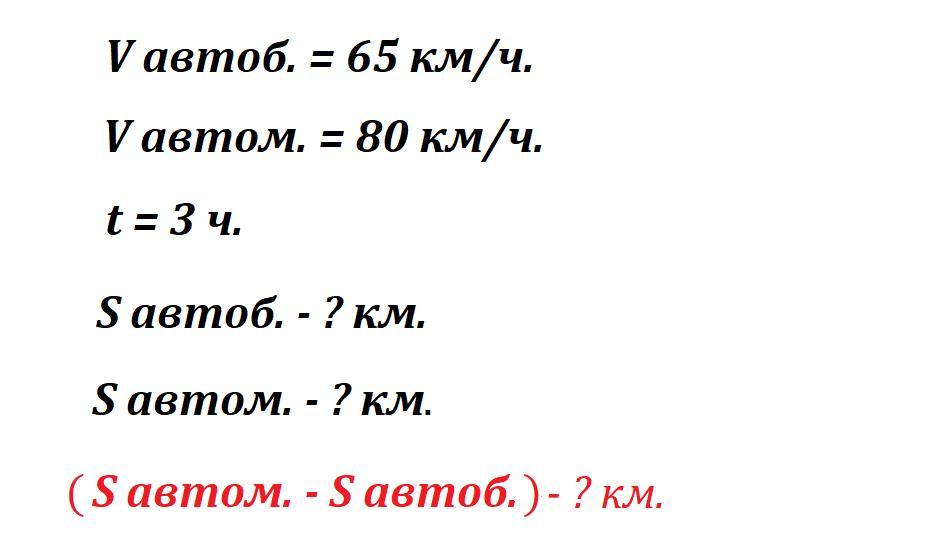 Из города А одновременно в одном и том же направлении выехали автобус и автомобиль. Автобус за час проезжает 65 км, а автомобиль 80 км. На сколько километров через три часа автомобиль окажется дальше автобуса?