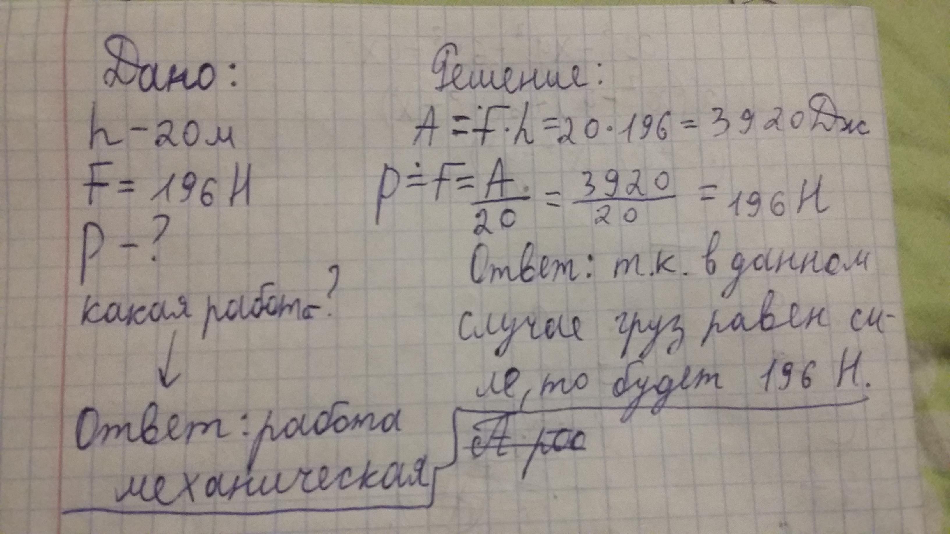 Какой груз можно поднять при помощи подвижного блока на высоту 20 м,если тащить веревку с силой 196 Н.Какая при этом будет совершена работа? Решите задачу с дано пожалуйста, 100 баллов