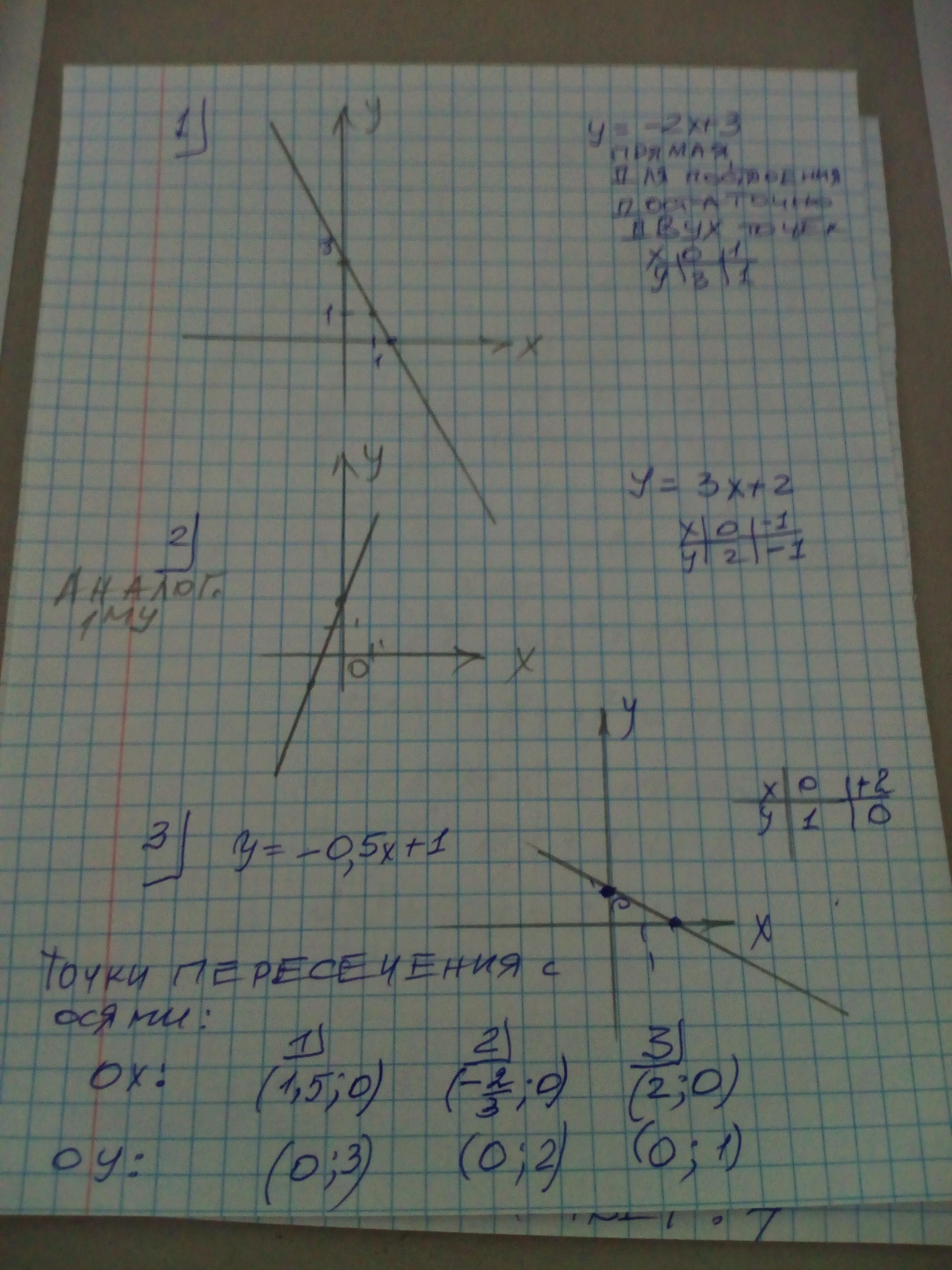 СРОЧНО!!!!!! плиз даю 100 балов как можно быстрей ) построить графики: 1. y=-2x+3 2. y=3x+2 3.y=-0.5x+1. Для каждого графика найти точки пересечения с осями координат.
