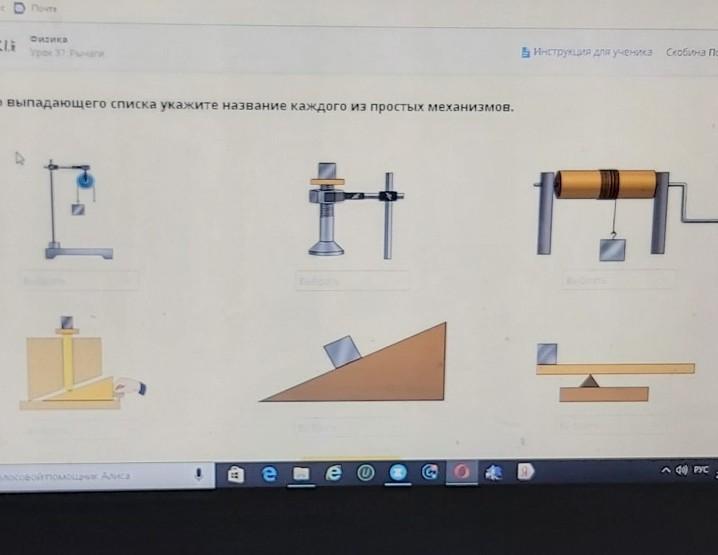 с помощью выпадающего списка Укажите название каждого из простых механизмов