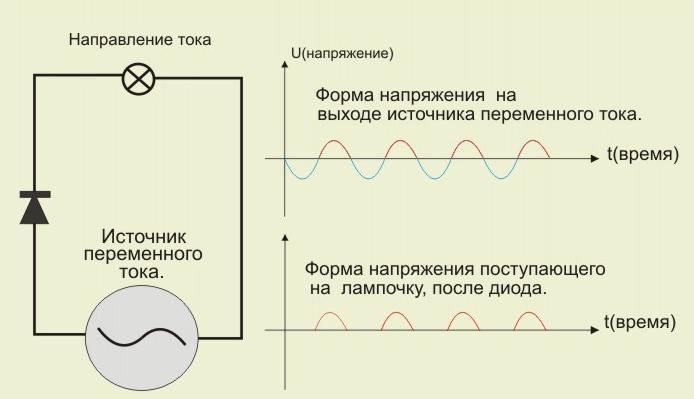 2. Диод имеет свойства пропускать электрический ток только в одном направлении и только постоянное напряжение. В случае переменного тока, диод будет срезать положительную или отрицательную составляющую сигнала, пропуская другую. То есть, если полярность тока изменится, то диод не выпустит его наружу, а в случае с переменным напряжением, будет срезать половину от сигнала (см. картинку 2)