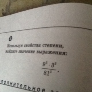 frac{9^{5}*3^{3}}{81^{3}} = frac{9^{5}*3^{3}}{9^{2*3}} =frac{9^{5}*3^{3}}{9^{6}}=frac{3^{3}}{9^{1}}=frac{3^{3}}{3^{2}}=3