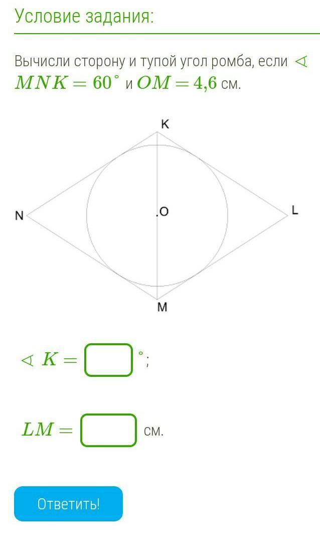 Вычисли сторону и тупой угол ромба, если ∢ MNK =60° и OM = 4,6 см.