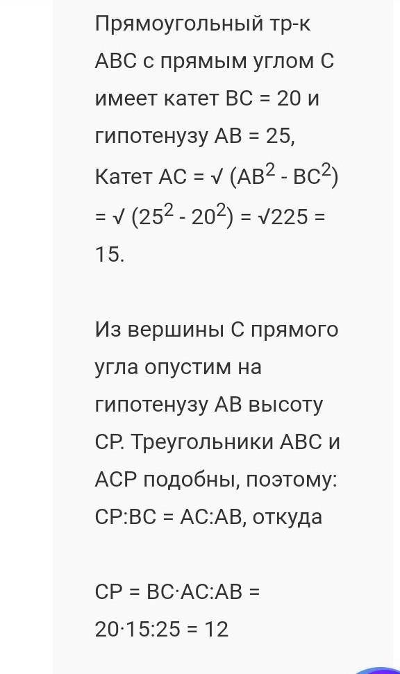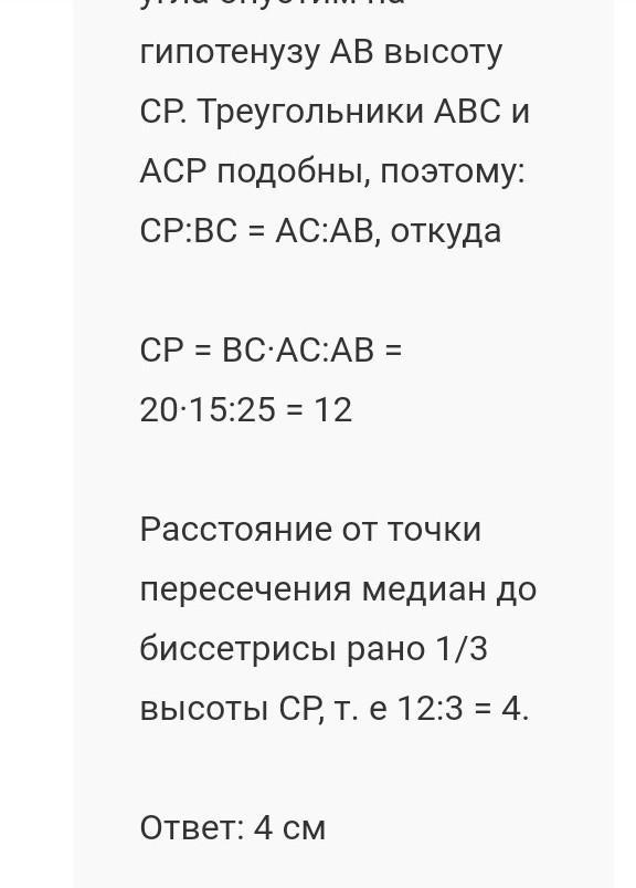 Найдите расстояние от точки пересечения медиан прямоугольного треугольника до его катета, равного 20, если гипотенуза равна 25