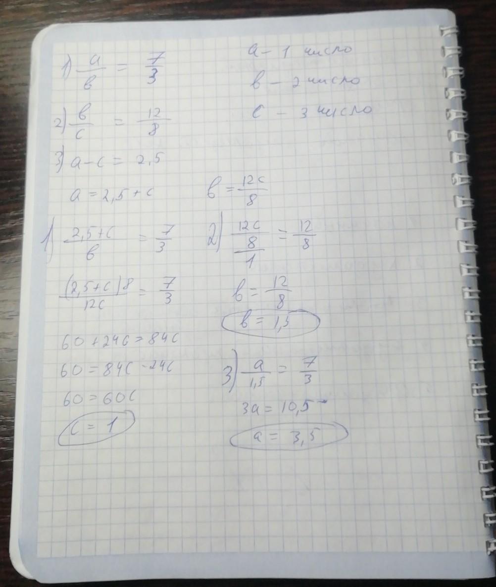 Ребят, помогите, пожалуйста, математика 6 класс.Найдите три числа, если известно, что первое число относится ко второму как 7:3, второе к третьему - как 12:8, а разность первого и третьего равна 2, 5. С решением и объяснением. Дам 50 баллов.
