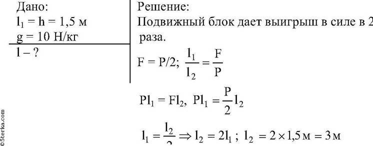 С помощью подвижного блока груз подняли на высоту 1,5м. На какую длину при этом был вытянут свободный конец верёвки? С рисунком