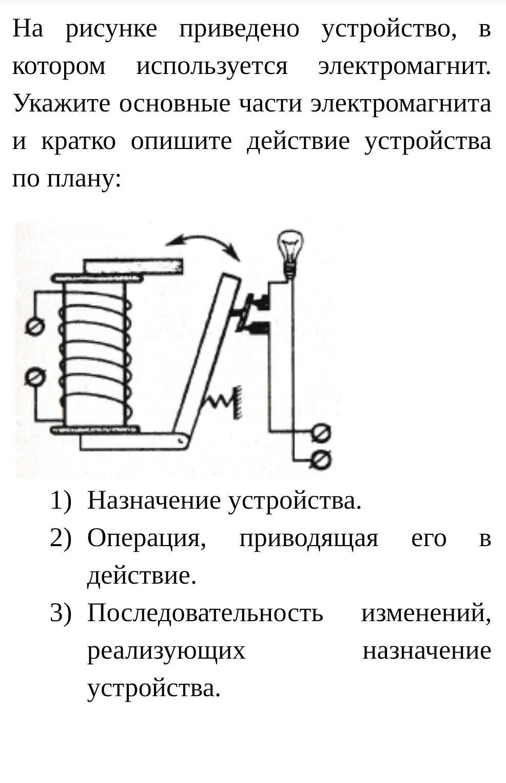 На рисунке приведено устройство, в котором используется электромагнит. Укажите основные части электромагнита и кратко опишите действие устройства по плану: