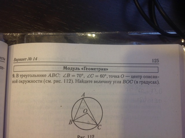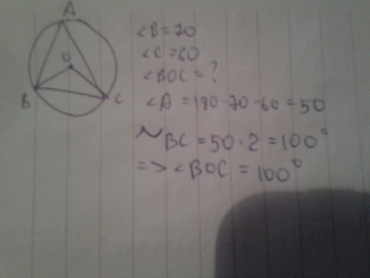 тогда угол А равен 180-60-70=50, тогда угол А как вписанный опирается на дугу ВС , то есть угол ВОС =2*50=100