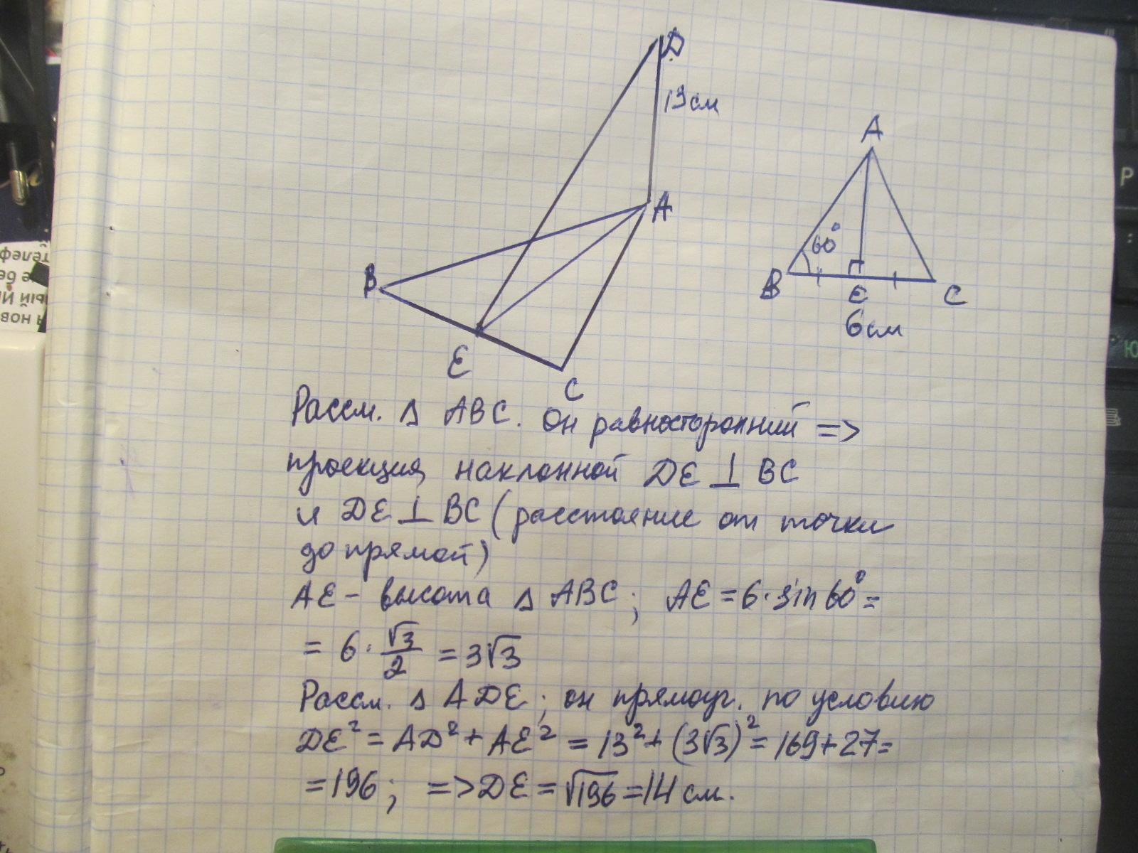Из вершины равностороннего треугольника АВС восстановлен перпендикуляр AD к его плоскости. Определите расстояние от точки D до прямой ВС, если AD = 13 см, а ВС = 6 см.