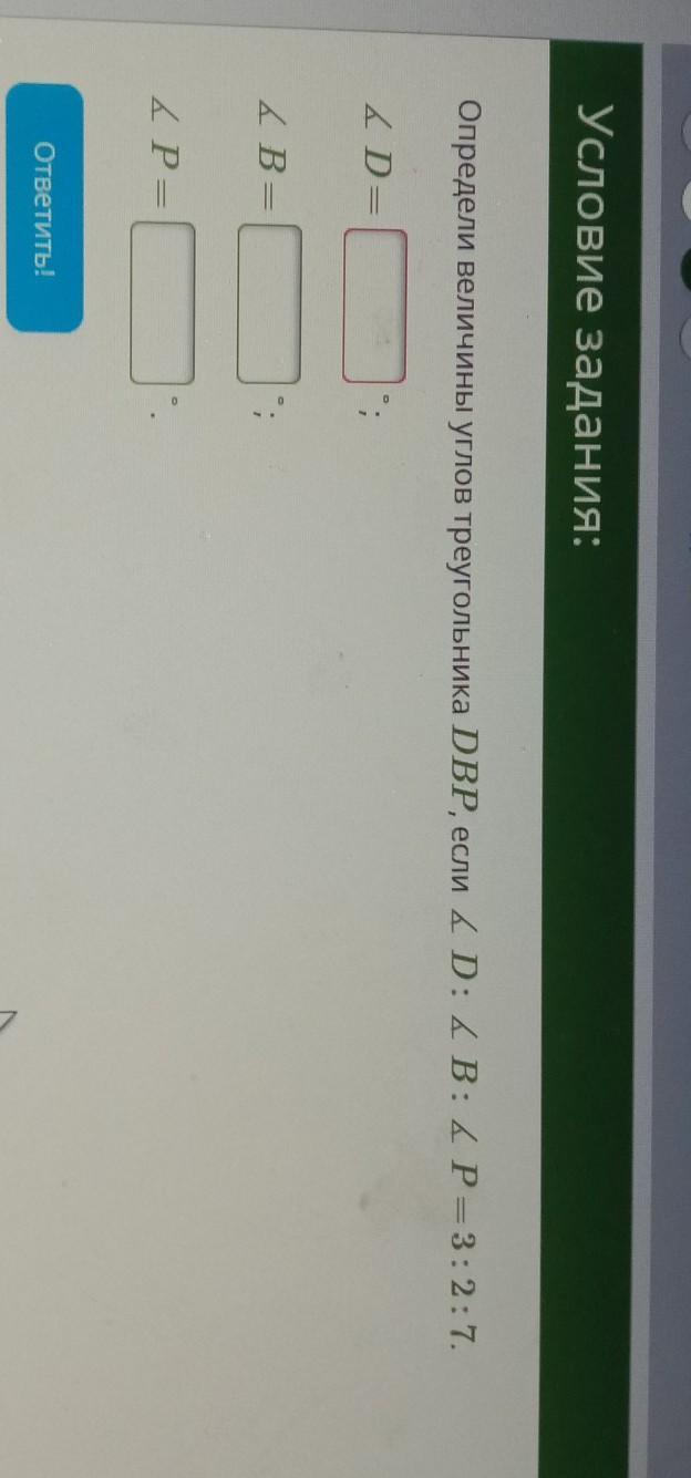 Пусть угол D = 3х, угол В = 2х, угол Р = 7х. Сумма углов в треугольнике = 180°.
