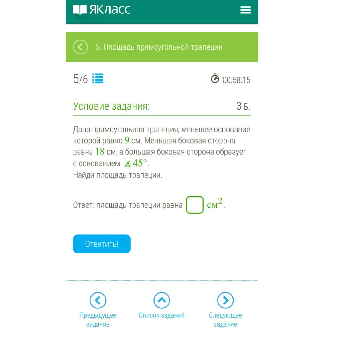 Дано:АВСД-трапеция, ∠А=90°, ВС=9 см, АВ=18 см, ∠Д=45°.