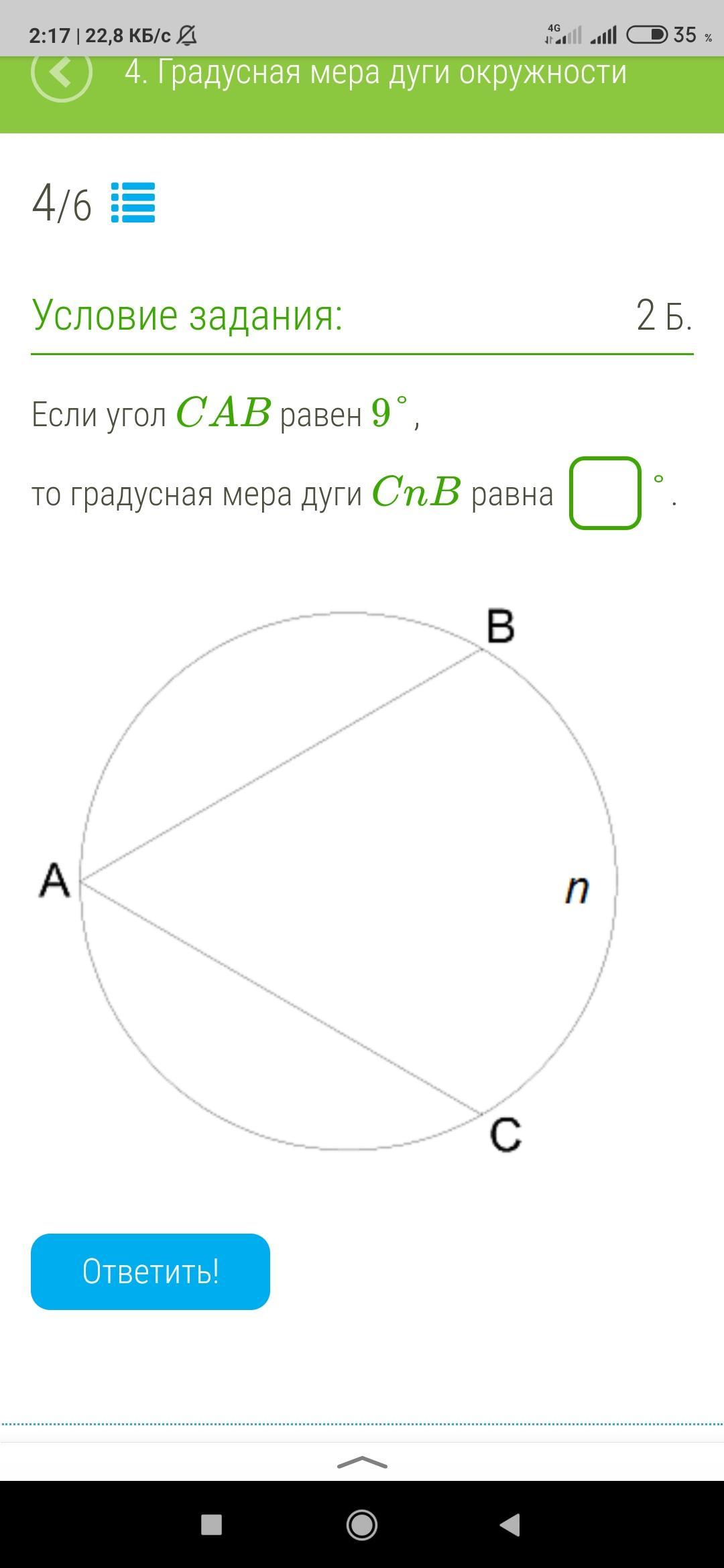 Следовательно, дуга CnB=2×CAB=2×9=18
