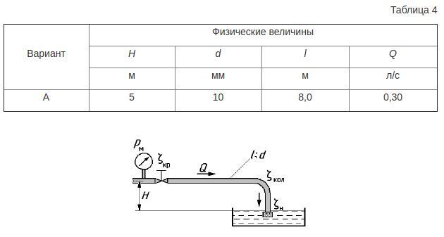 Отработанное масло сливается из гидросистемы по шлангу длиной l и диаметром d в бак-отстойник, расположенный ниже трубопровода гидросистемы на величину Н. Определить потребный напор Нпотр в месте установки манометра и его показание pм, если известен расход масла Q. При решении учесть потери: на трение в шланге, в кране ζкр = 2,5, на поворот ζкол = 0,5 и в насадке на выходе из шланга ζн = 7. Скоростным напором из насадка пренебречь. Принять плотность масла ρ = 900 кг/м3, вязкость ν = 0,5 см2/с, режим течения ламинарный. (Величины Q, H, l и d взять из таблицы 4).