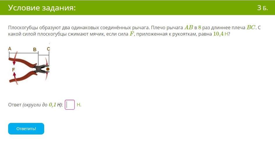 Плоскогубцы образуют два одинаковых соединённых рычага. Плечо рычага AB в 8 раз длиннее плеча BC. С какой силой плоскогубцы сжимают мячик, если сила F, приложенная к рукояткам, равна 10,4 Н?