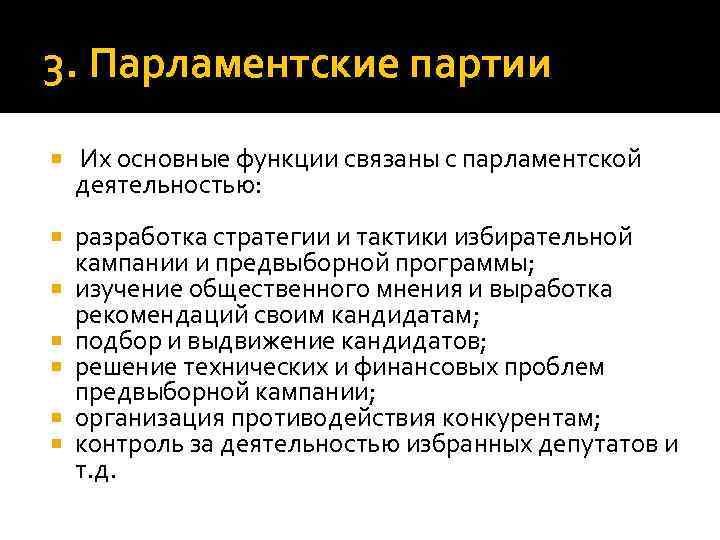 парламентская партия - политическая партия, федеральный список кандидатов которой был допущен к распределению депутатских мандатов в Государственной Думе Федерального Собрания Российской Федерации
