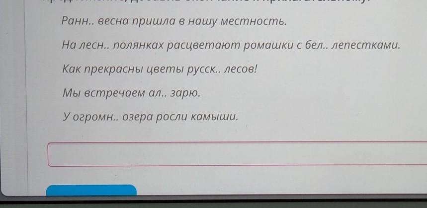 Найдите предложение с прилагательными в родительном падеже, единственном числе. Запишите это предложение, добавив окончание к прилагательному.