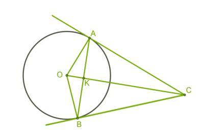 Из точки C проведены две касательные к окружности, точки касания — A и B . Определи равные отрезки и углы.