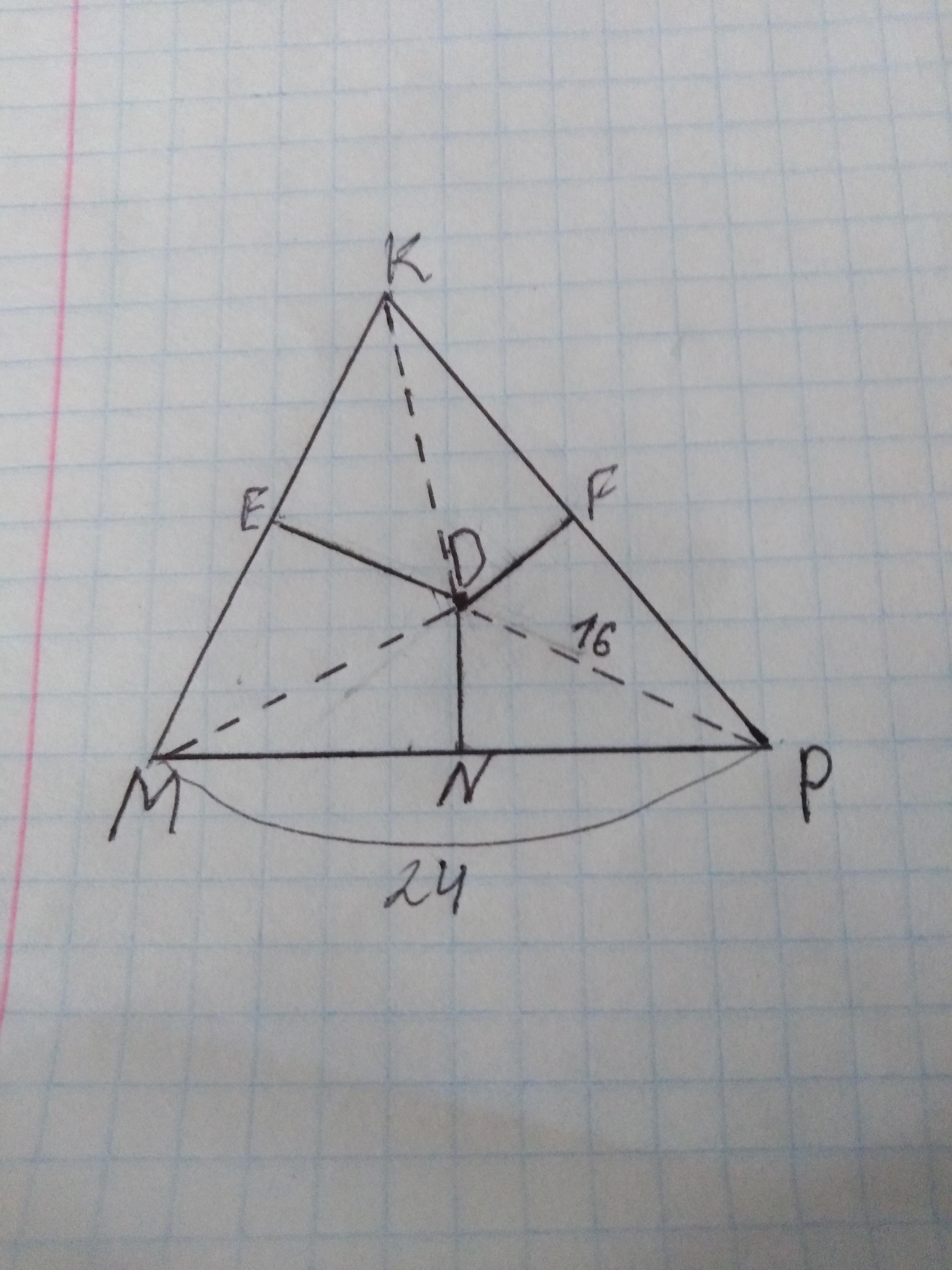 СРОЧНО!!!!! Сторона MP треугольника MKP равна 24. Серединные перпендикуляры к сторонам этого треугольника пересекаются в точке D, причём DP = 13. Найдите расстояние от точки D до стороны MP.