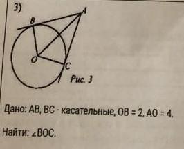 дано АВ,ВС-касательная,ОВ=2,АО=4найти угол ВОС.Пожалуйста срочно!!!​