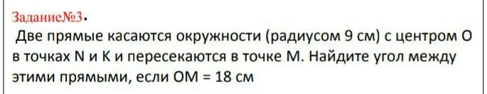 меньший катет равен 9 см (радиус ОК), гипотенуза равна 18 см, т.е. она в 2 раза больше, а это значит что угол ОМК,как и угол ОМN равен 30 градусам. 30*2=60 градусов - угол NМК