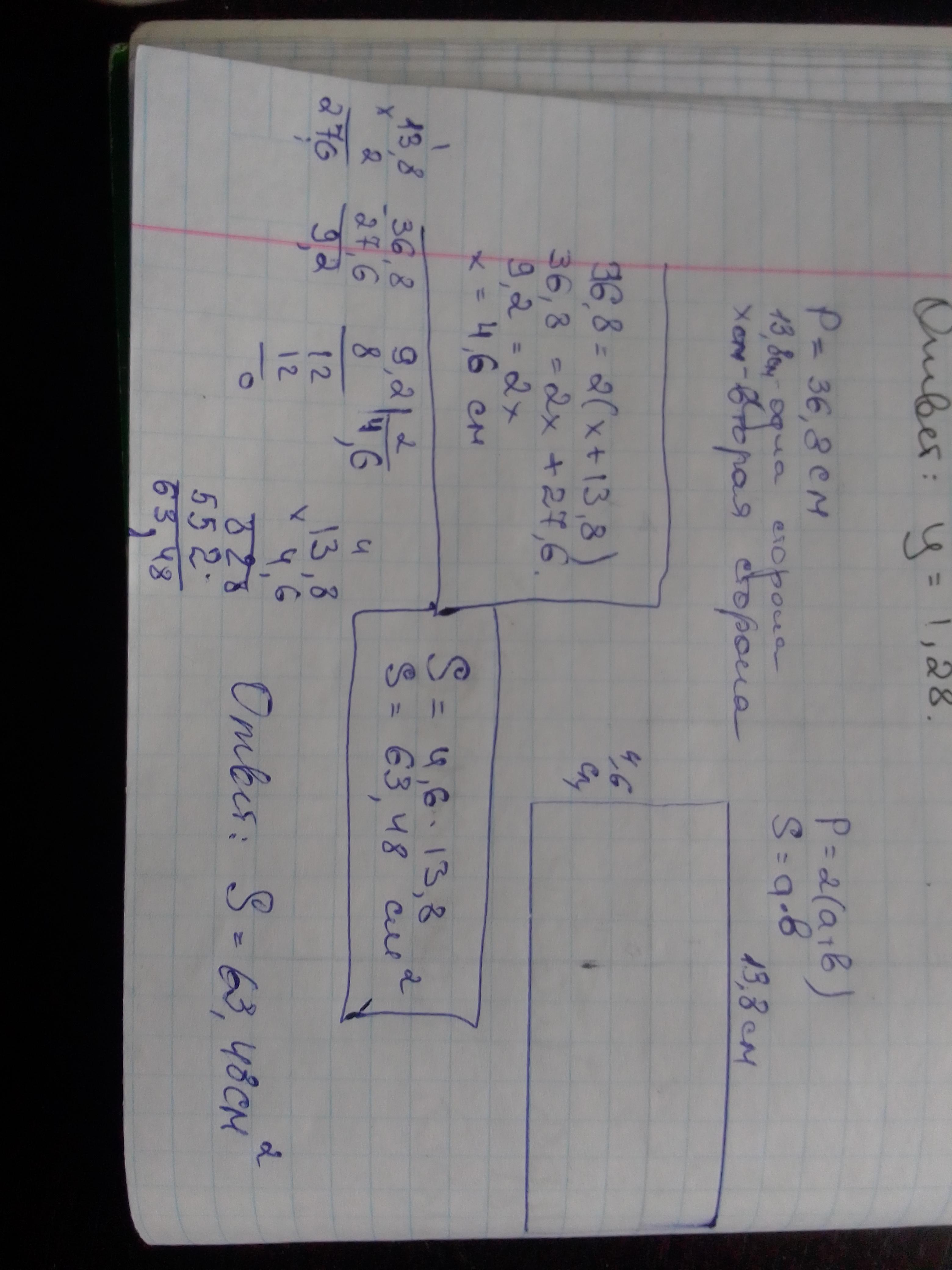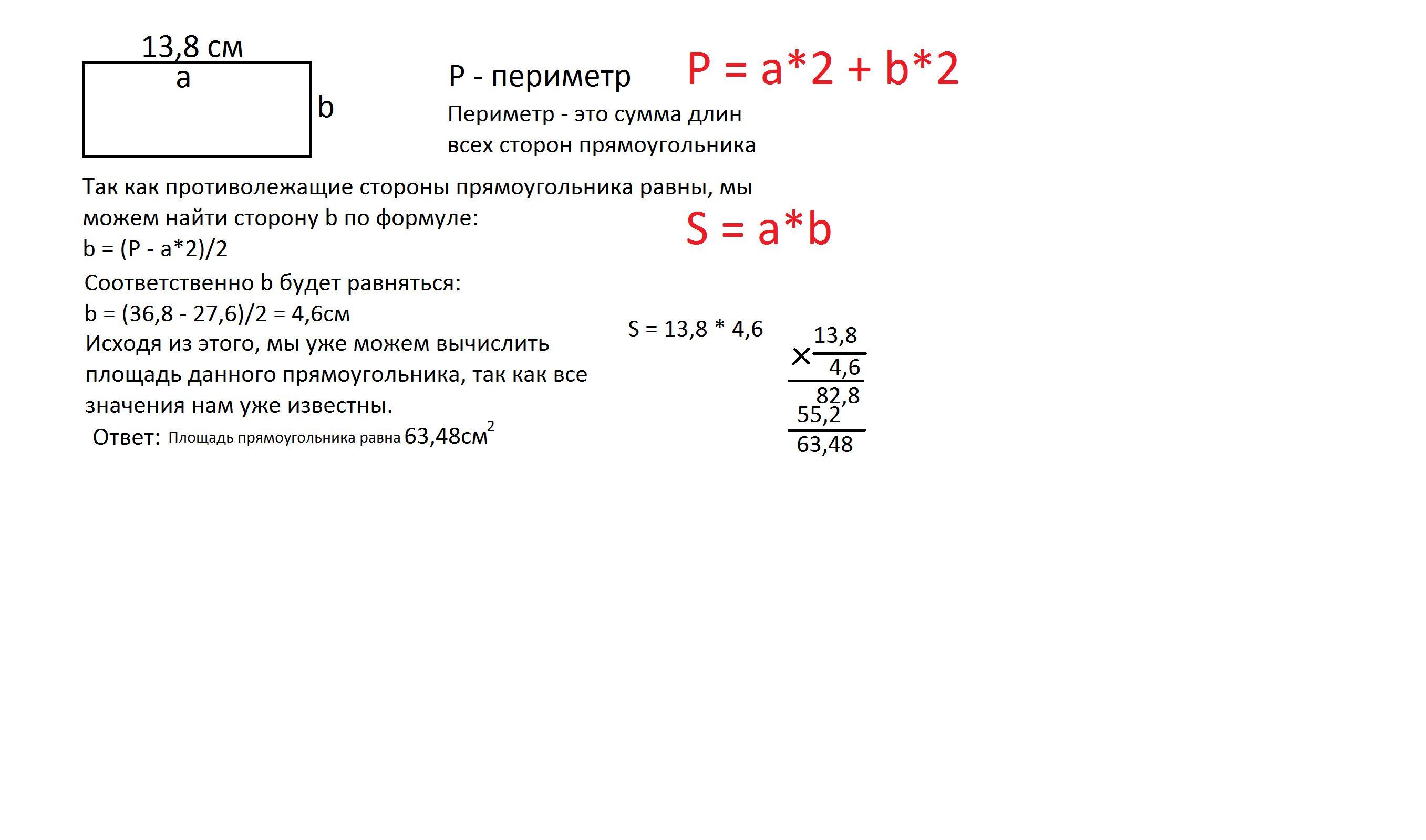 Периметр прямоугольника равен 36,8 см, а одна из его сторон − 13,8 см. Вычислите площадь прямоугольника.