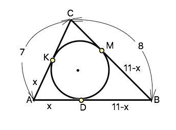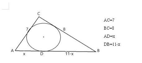В остроугольный треугольник АВС вписана окружность, которая касается основания АВ в точке D. Сторона АС=7, ВС=8. Отрезок АD=х, BD=11-х. Найдите х.