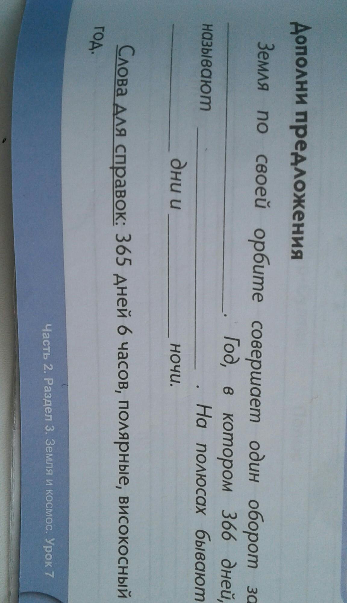Дополни предложение. Земля по своей орбите совершает один оборот за ________. Год, в котором 366 дней, называется ________. На полюсах бывает _____ дни и _______ ночи. Слова для справок: 365 дней и 6 часов, полярные, високосный год.