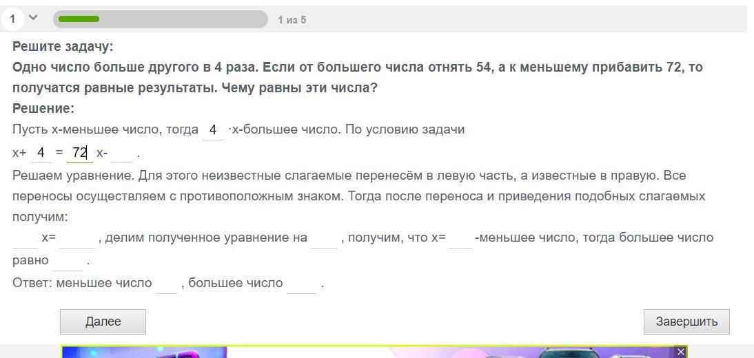 Одно число больше другого в 4 раза. Если от большего числа отнять 54, а к меньшему прибавить 72, то получатся равные результаты. Чему равны эти числа? Решите задачу с помощью уравнений! НУЖНО ЗАПОЛНИТЬ ВСЕ ПОЛЯ НА КАРТИНКЕ!