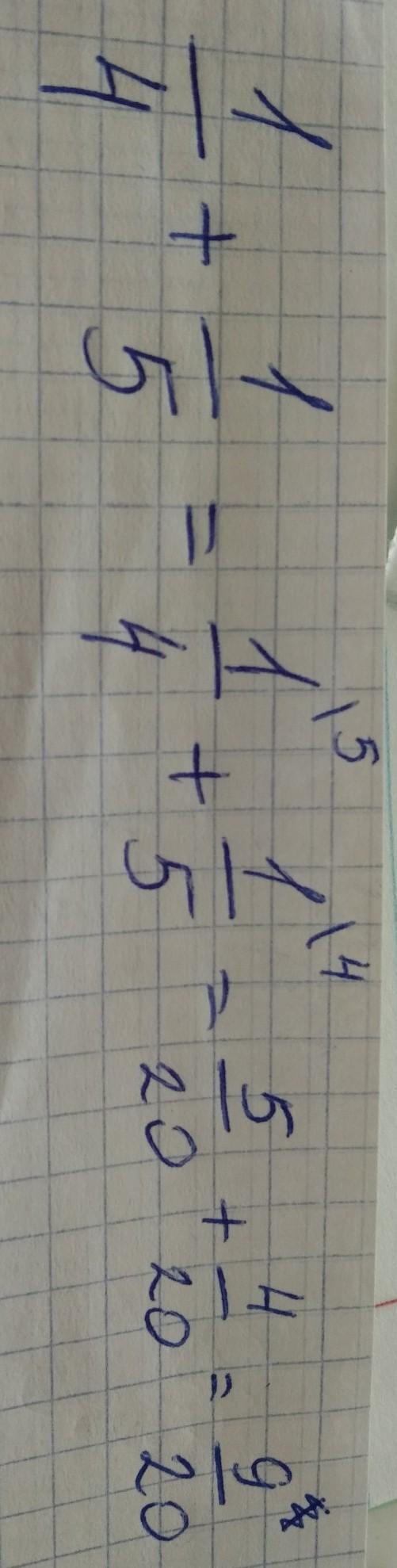 В начале находим общий знаменатиль. После числа на которые мы умнажали знаменатиле, умножаем на числители. В результате получаем 1/5=4/20 и 1/4=5/20. Плюсуем знаменатель оставляем без изменений, а числительные складываем выходит 9/20