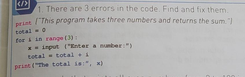 There are 3 errors in the code. Find and fix them. (В коде есть 3 ошибки. Найдите и исправьте их.) Инфоматика