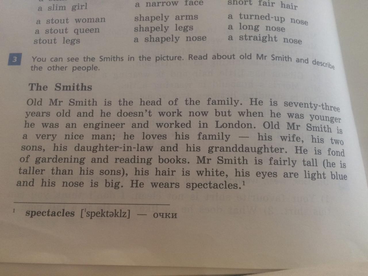 Mr Smith is fairly tall,his hair is white his eyes are light blue and his nose is big.He weres spectacles