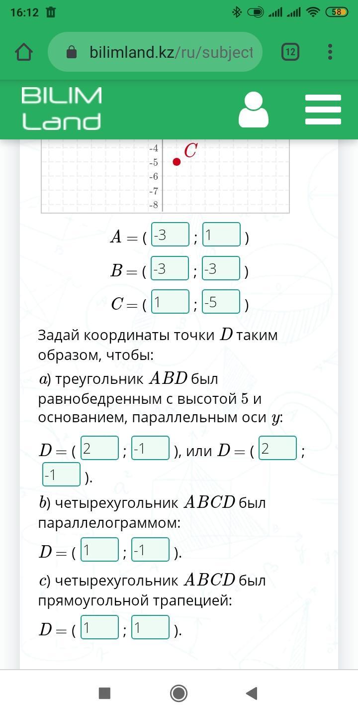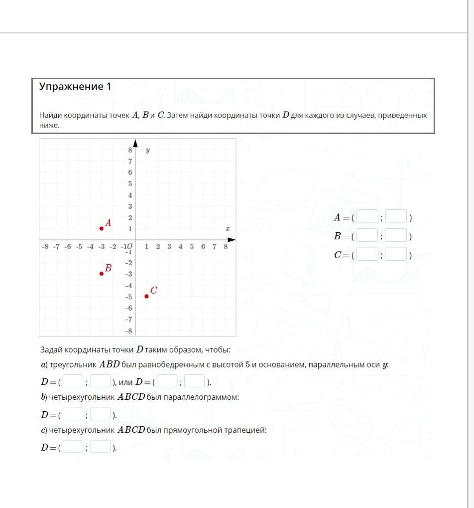 Срочно !!!!!! Даю 30 баллов . Найдите координаты точек А,В и С . Затем найдите координаты точки Д для каждого из случаев приведенных ниже