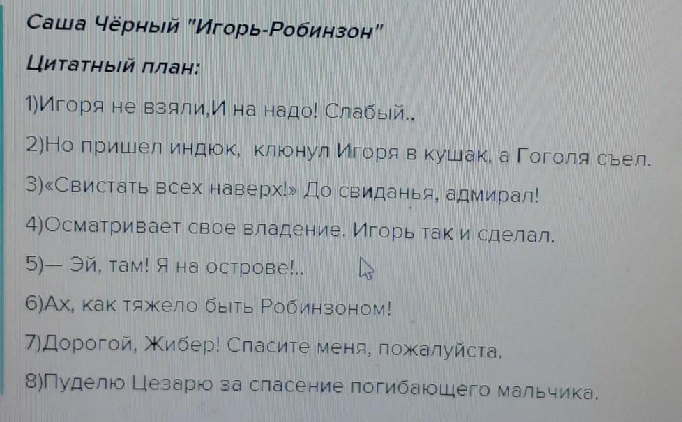 Составьте цитатный план по "Игорю Робинзону" Саши Черного